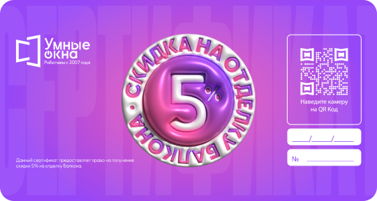 Скидка 5% на отделочные работы балкона или лоджии при заказе в период действия акции «Выгодные балконы».